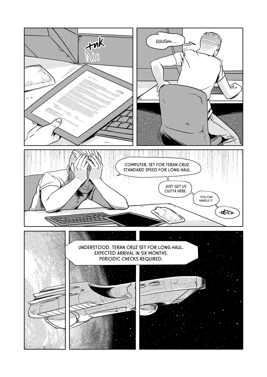 Worldbuilding was never my main pursuit, so I backed myself into a bit of a corner putting in a keyboard here. I lampshaded it later in order to explain it. I remember between 2013 and 2015 I took multiple stabs at this page, still not intending to actually make a comic until I tuned into a fever pitch that made me start for real in 2015.