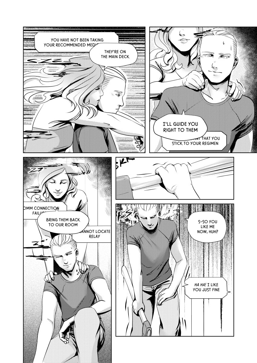 In the print version I realized I had made the text a little too big, so I set to work reducing the size of every piece of text throughout the whole book. Changing the word bubbles themselves to go with the text would have resulted in too much work, so I simply let the words hang out in slightly oversized bubbles. I see I missed changing the font size of one of the lines on this page, however.